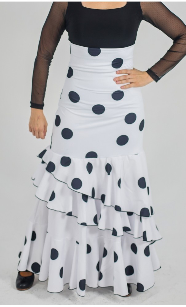 Saia flamenca feita em malha de poliéster com elastano. Possui corpo forrado, e dois babados em estilo caracol, um saindo enviesado na altura do quadril e outro na barra. Pode ser usada com a pala alta ou dobrada na cintura. Comprimento ajustável dobrando-se a pala sobre o quadril.