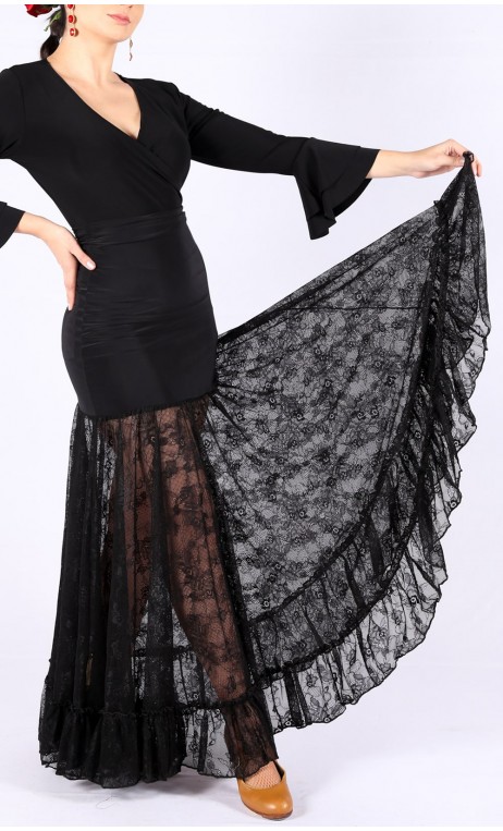 Saia flamenca leve tipo anágua com corpo feito em malha de poliéster e elastano e godê da saia feito em malha de poliéster. Possui um babado de renda na barra. Comprimento ajustável dobrando a pala na cintura.