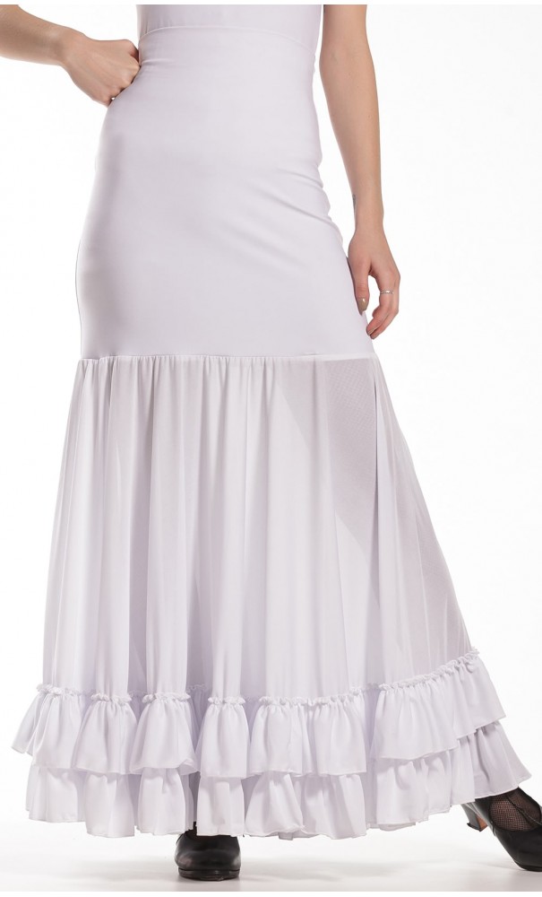 Light weight godet petticoat-skirt with two ruffles in the bottom. The skirt body is made of polyester and spandex fabric and the godet part is made of polyester fabric. The length of the skirt can be adjusted by folding the waistband over the waist.