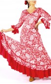 Flamenco long-dress made of polyester and spandex fabric with exclusive digital print. Features 3/4 sleeves and V-neck. The godet part is made of polyester fabric, and it has one ruffle in the bottom with trim details. It has a great "vuelo".