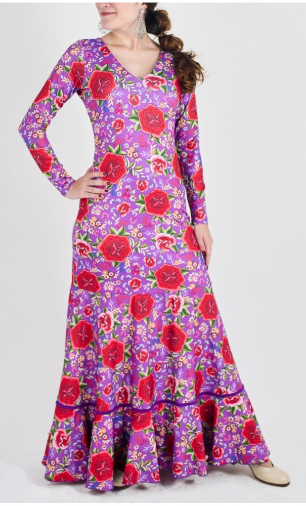 Flamenco long-dress made of polyester and spandex fabric with exclusive digital print. Features long sleeves and V-neck. The godet part is made of polyester fabric, and it has one ruffle in the bottom with trim details. It has a great "vuelo".