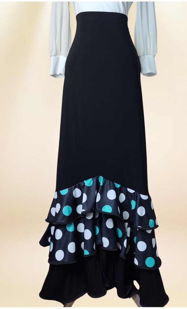 Flamenco Long-skirt made of polyester and spandex fabric. Body double lined, features with three ruffles starting at knee-height. The length of the skirt can be adjusted by folding the waist part over the hip. Ruffles trimmed with solid piping.