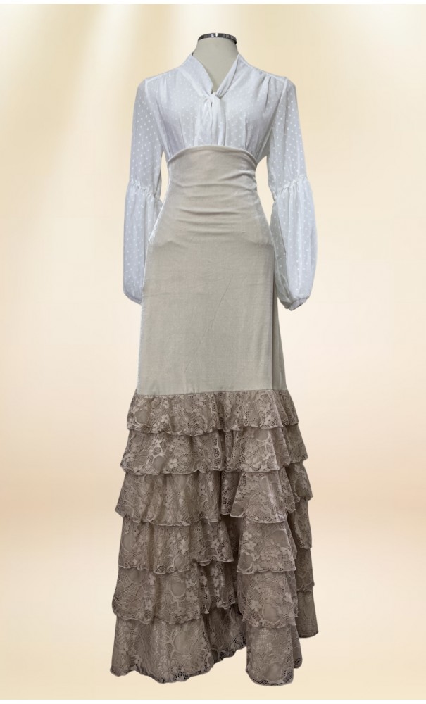 Beige Velvet Flamenco Skirt w/Lace Ruffles
