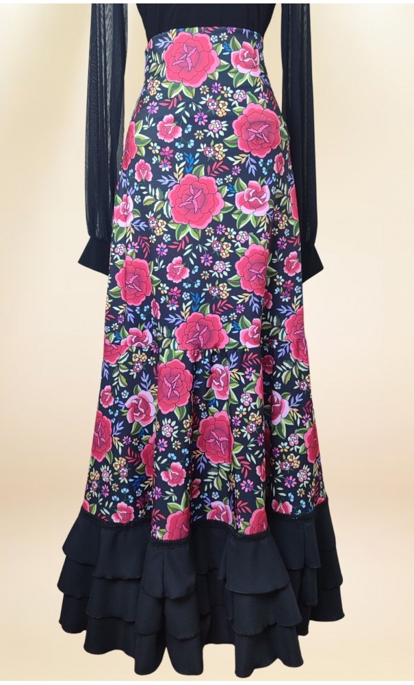 Flamenco skirt made of polyester and spandex fabric. Featuring a lined body and a skirt panel with one large double lined ruffle with trim detail. The length of the skirt can be adjusted by folding the waistband.