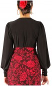 Blusa flamenca trespasada hecha en punto de poliéster con elastán. Tiene manga larga ablusada fruncida al hombro y puño con botones.
