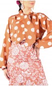 Camisa estilo malla con shorts, hecha en tela de poliester. Manga larga com puño fruncido. Con detalle en cuello arrematado con un lazo largo y con botones cierrando la camisa.