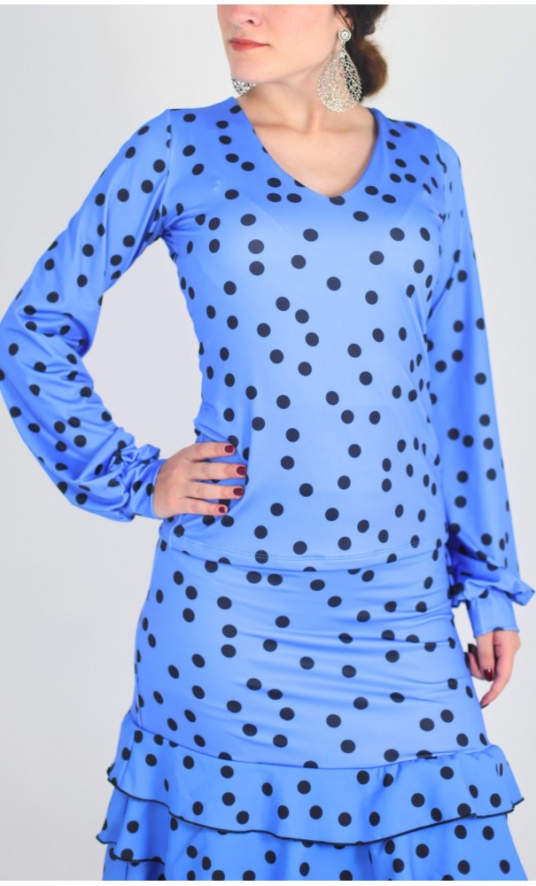 Blusa hecha en punto de polyester con elastán, con estampa digital. Tiene escote V y mangas largas ablusadas con puño.