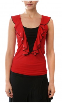Blusa hecha en punto de encajes de poliamida con elastán. Tiene manga 3/4 con volantes. Cuerpo doble forrado.