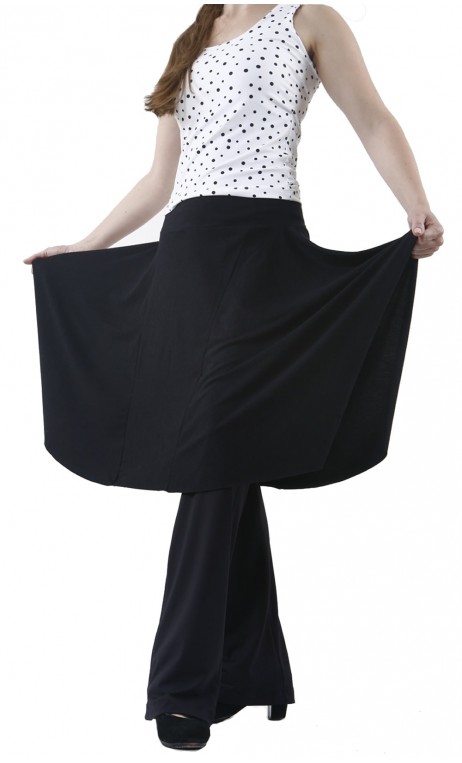 Falda corta confeccionada en punto elástico de poliéster con elastán. Está hecha con dos godets en los costados para amplio vuelo.